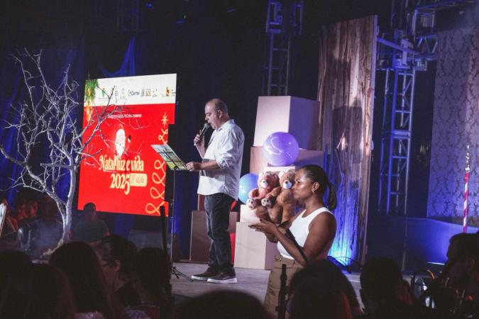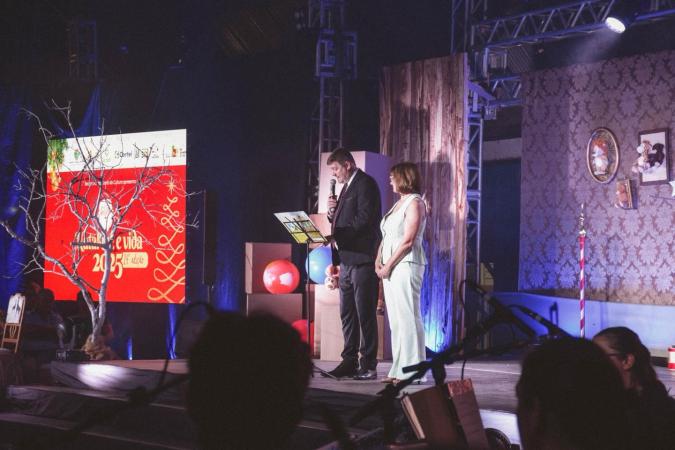 Desde a abertura, com luzes suaves e música instrumental natalina, o público foi convidado a viver uma noite de reflexão, fé e esperança. A mensagem central do espetáculo, “A História de um Natal Sem Neve”, trouxe uma reflexão sensível sobre os desafios enfrentados nos últimos anos, especialmente diante dos eventos climáticos, reforçando que o verdadeiro sentido do Natal nasce no coração, na família e na fé no nascimento de Jesus Cristo.