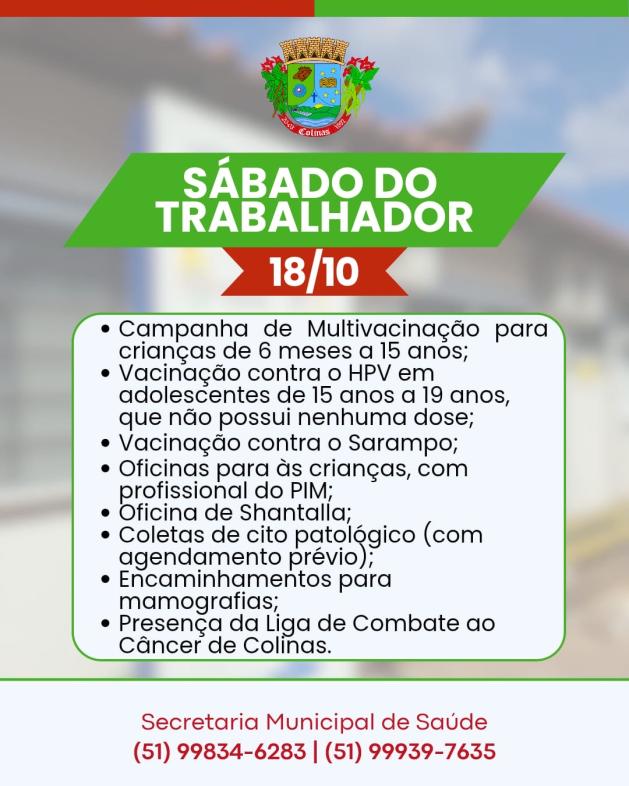 No próximo sábado, dia 18 de outubro, a Secretaria Municipal de Saúde de Colinas realiza mais uma edição do Sábado do Trabalhador, uma iniciativa voltada à promoção da saúde e ao cuidado com a comunidade.