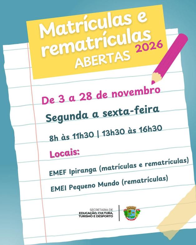 As matrículas e rematrículas nas escolas municipais de Colinas estarão abertas de 3 a 28 de novembro, de segunda a sexta-feira, das 8h às 11h30 e das 13h30 às 16h30.