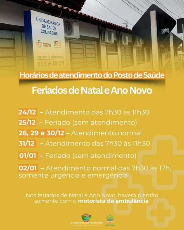 Nos dias 26, 29 e 30 de dezembro, o Posto de Saúde funciona em horário normal. No dia 31 de dezembro, o atendimento volta a ser em horário reduzido, das 7h30 às 11h30. Em 1º de janeiro, feriado de Ano Novo, não haverá atendimento.